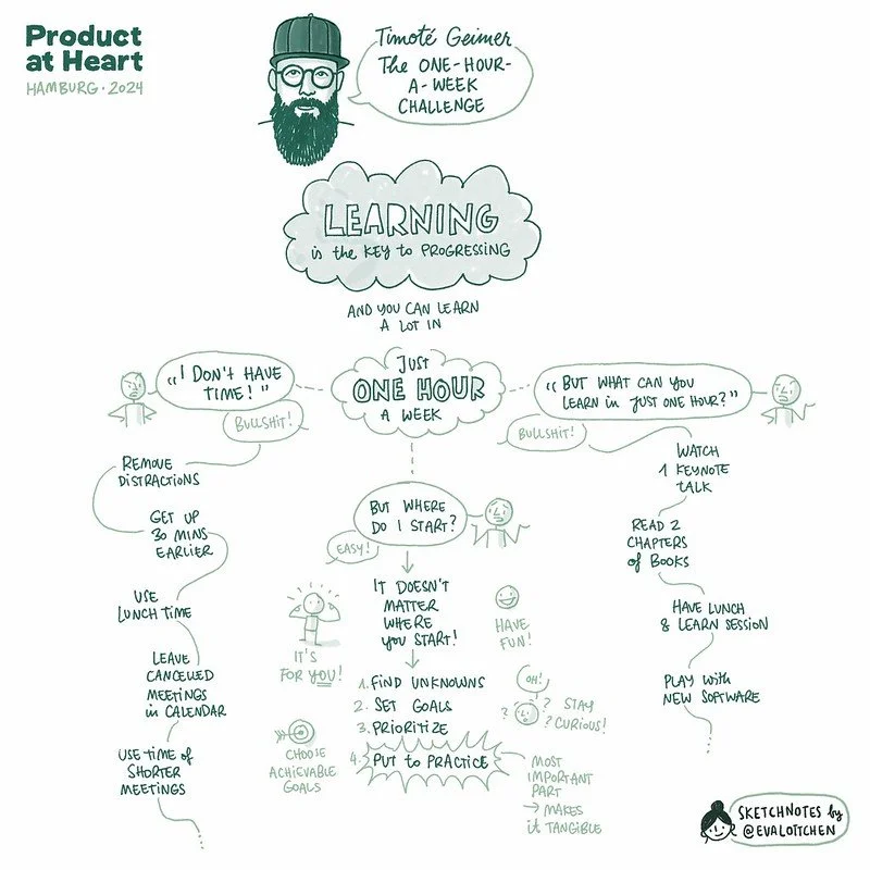 In the context of the Product at Heart conference, Timoté asked participants to review the whole day and consider which talk surprised them or taught them something they didn’t know, or perhaps the idea that would have the most impact on their work in the next week. Once they’d narrowed in on a single idea, he asked them to picture what they needed. How would they measure the success of that new knowledge acquisition? Where could they find that information? How would they find an hour in their week to go through it?