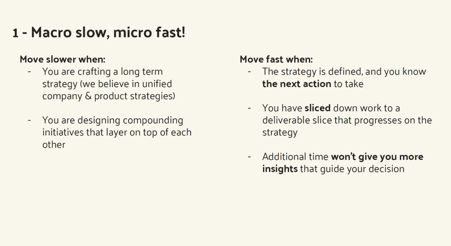 The slide below offers his takeaways: You should move slower when you’re looking at the big picture of unified company and product strategy or when you’re designing compounding initiatives that layer on top of each other. But you can move fast once the strategy has been defined and you know the next action you need to take, you’ve broken work down into a deliverable “slice” that progresses your strategy, or when additional time won’t give you more insights that guide your decision.